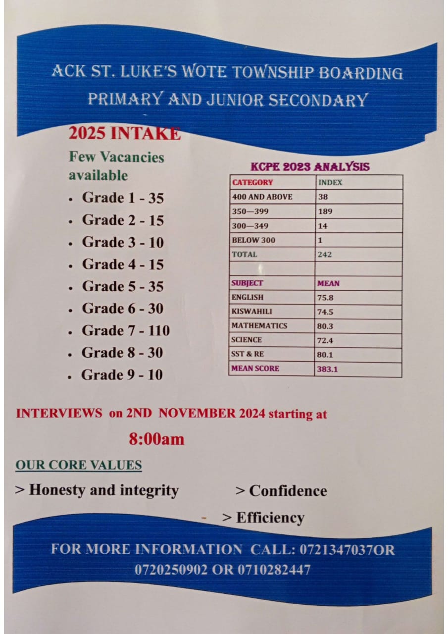Interviews For The 2025 Intake Will Be Conducted On Saturday 2nd November 2024 Starting 8.00am. Vacancies Available In All Grades - Lower Primary To Junior School. Welcome.